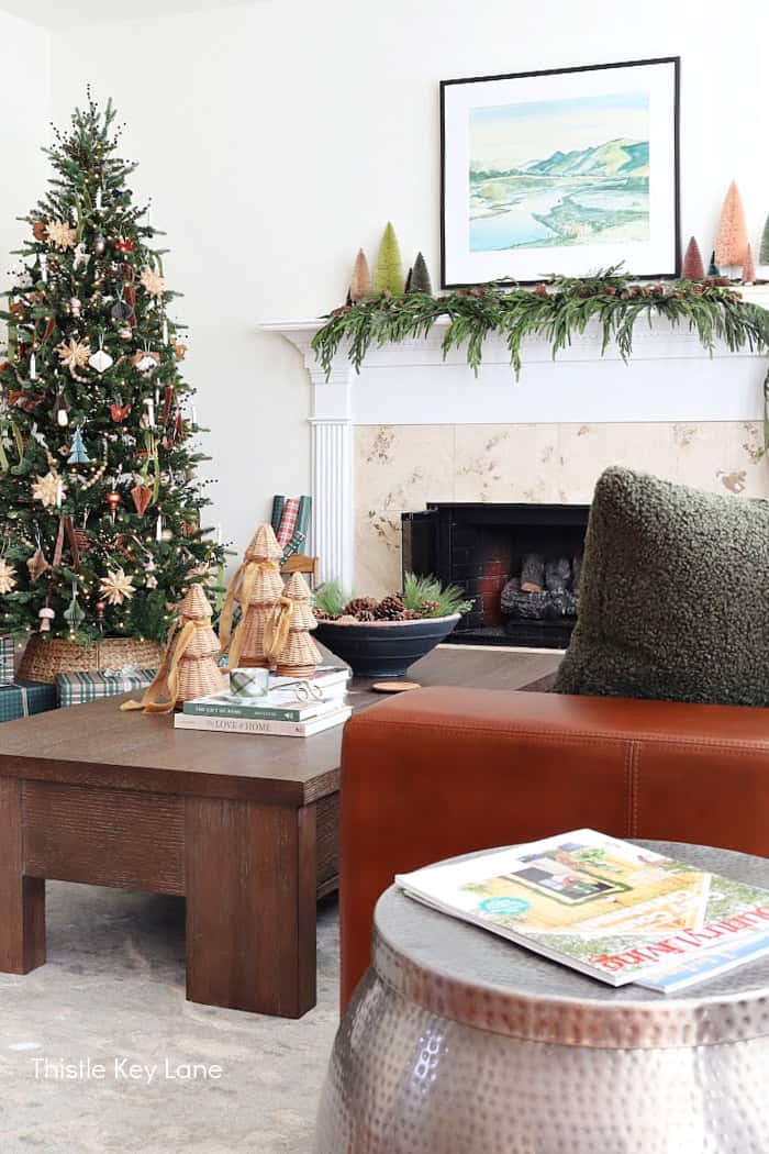 Our mile wide coffee table features our everyday accessories. Stacks of books and a large terracotta bowl are spruced up with pinecones, greenery and wicker trees. It’s so easy to use what you already have on display and give it a holiday makeover.