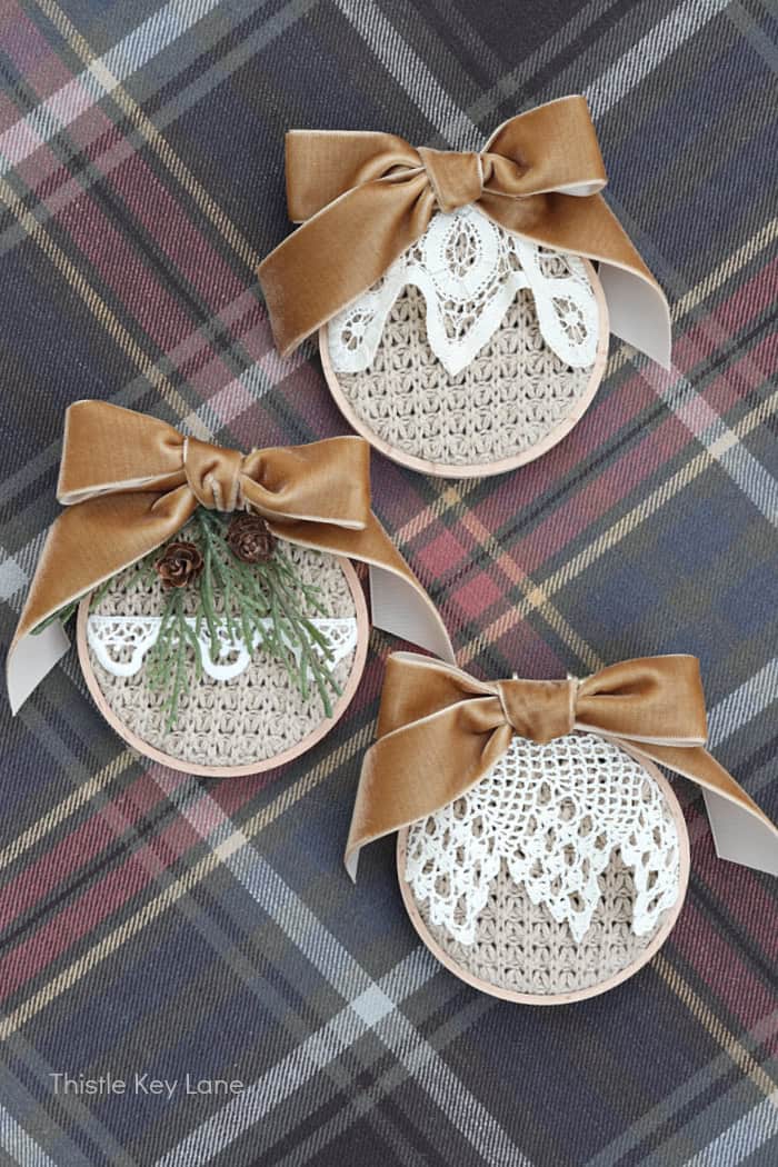 I decided to leave the two wide lace ornaments plain with just the ribbon. The lace detail is just too pretty to cover up with greenery, so I’m going to keep those simple yet charming. Which do you like best?