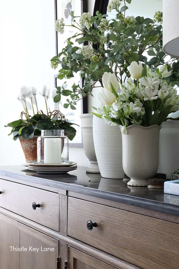 Floral Spring Vignette For Buffet Or Sideboard. See how to create a pleasing springtime display layering vases, flowers and artwork on your buffet or sideboard.
