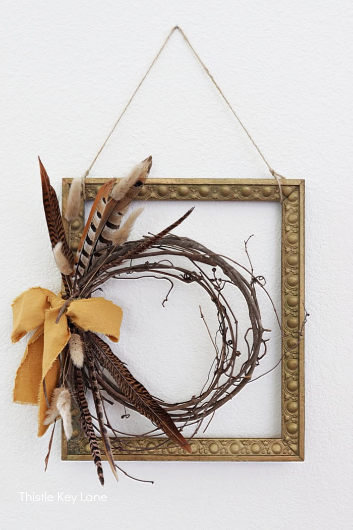 DIY Vintage Frame Wreath With Feathers. Follow these easy steps to create a stunning wreath combining a frame, grapevine, and feathers. It’s a very simple fall project that easily comes together with just a few craft supplies.