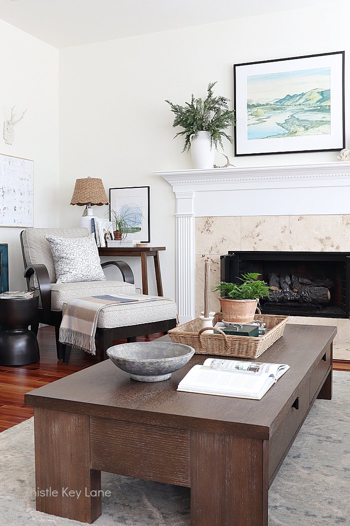 On the oversized coffee table I’m mixing several textural pieces in earthy browns and grays. The wicker tray is an excellent size to anchor books, a plant, candle holders and a vintage metal box. As we get closer to spring I can switch out some of these accessories for ones with lighter tones or textures.
